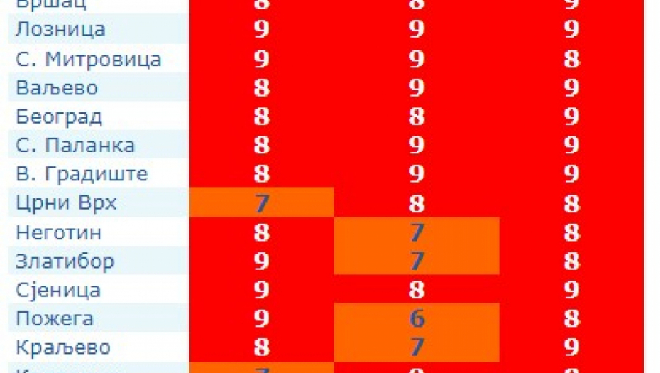 Tako će u Somboru ono biti niže, 6, a u južnim gradovima )Dimitrovrad, Priština, prozren, Vranje) indeks će iznositi 7. To su vrednosti koje spadaju u visoke, ali ne i "vrlo visoske".