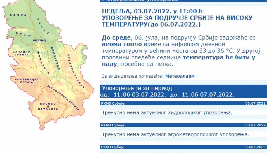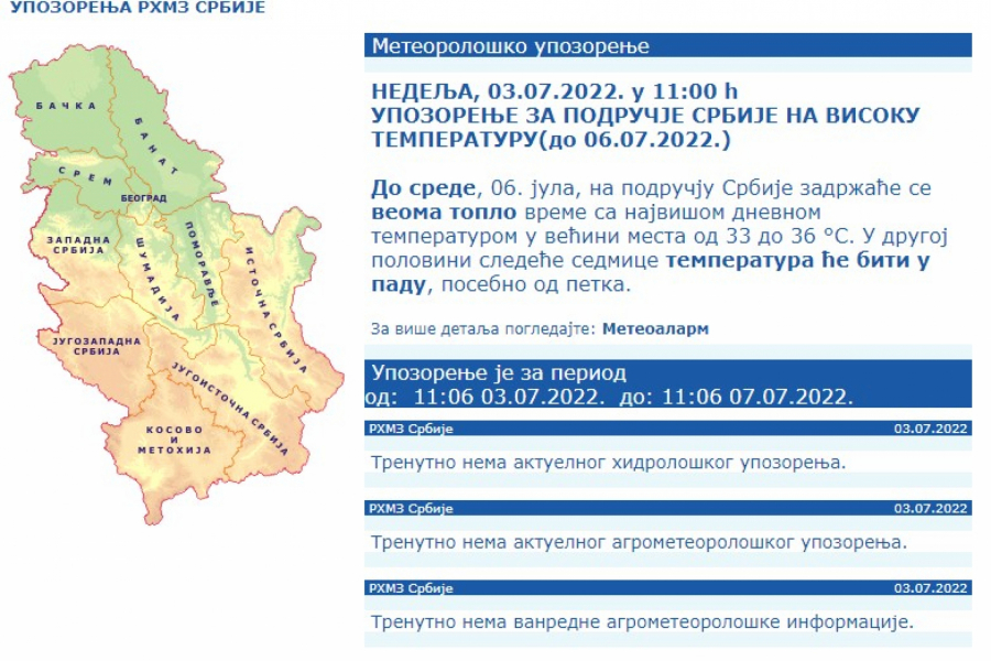 Republički hidrometeorološki zavod upozorio je na veoma visoke temperature, preko 35 stepeni u celoj zemlji, narednih dana ali i na veoma visoko ultravioletno zračenje koje takođe predstavlja opasnost po zdravlje pri dužem izlaganju.
