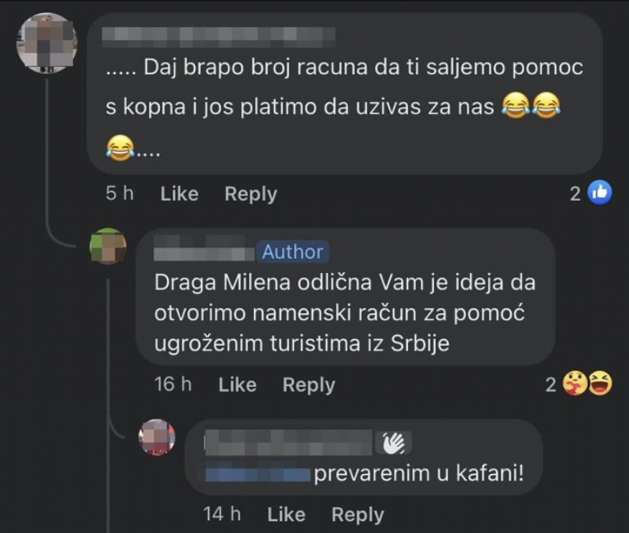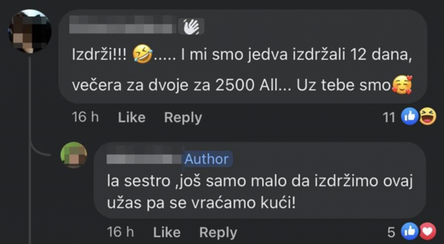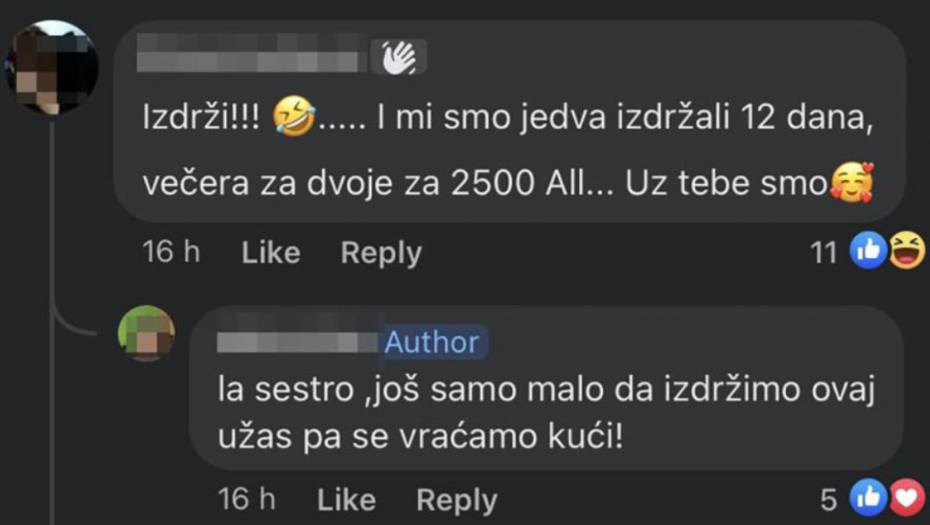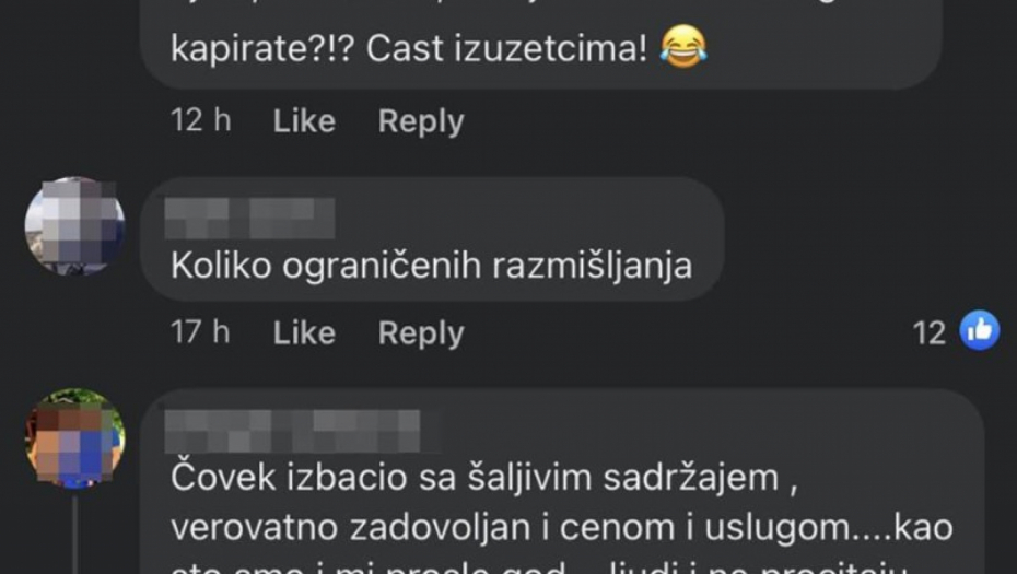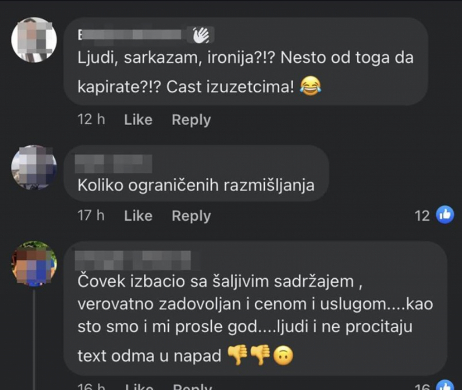 Komentari su nastavili da se nižu: "Meni je toliko zanimljivo da čitam komentare ovih koji ne shvataju", "Stvarno ne razumem, 1000 leka je manje od 1000 dinara. Pa kući biste dali samo za vino toliko!", "Toliko je i u Srbiji", "Ljudi, sarkazam, ironija?! Nešto od toga da kapirate?! Čast izuzecima!", "Čovek je izbacio post sa šaljivim sadržajem, verovatno zadovoljan i cenom i uslugom, kao što smo i mi prošle godine, ljudi i ne pročitaju tekst ali idu odmah u napad!"