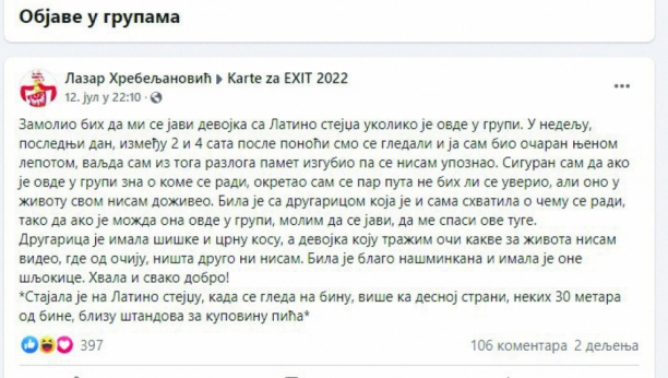DEČKO KOJI JE NA FEJSBUKU OBJAVIO DA SE ZALJUBIO U OČI PRELEPE DEVOJKE NA EGZITU ZA ALO! KAŽE: Ako mi se javi, zovem vas na svadbu