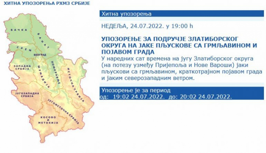 Za oko pola sata na jugu Zlatiborskog okruga (na potezu uzmeđu Prijepolja i Nove Varoši) očekuju se jaki pljuskovi sa grmljavinom, kratkotrajnom pojavom grada i jakim severozapadnim vetrom, saopšteno je iz Republičkog hidrometeorološkog zavoda Srbije.