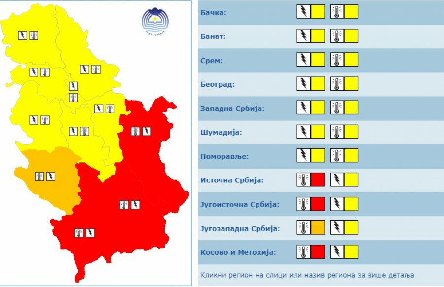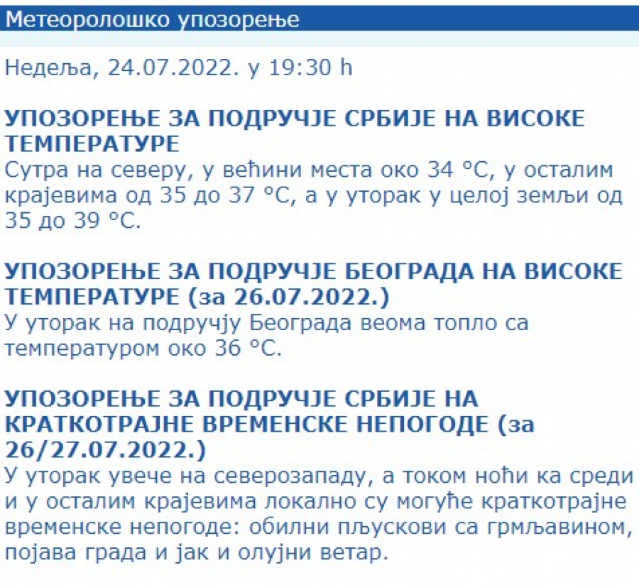 - Danas i sutra na jugu i istoku Srbije, a u utorak u celoj zemlji veoma toplo, od 35 do 38 °S, lokalno i 40 °S. Sredinom sedmice kratkotrajni pad temperature, a od petka ponovo veoma toplo- objavljeno je na sajtu RHMZ.