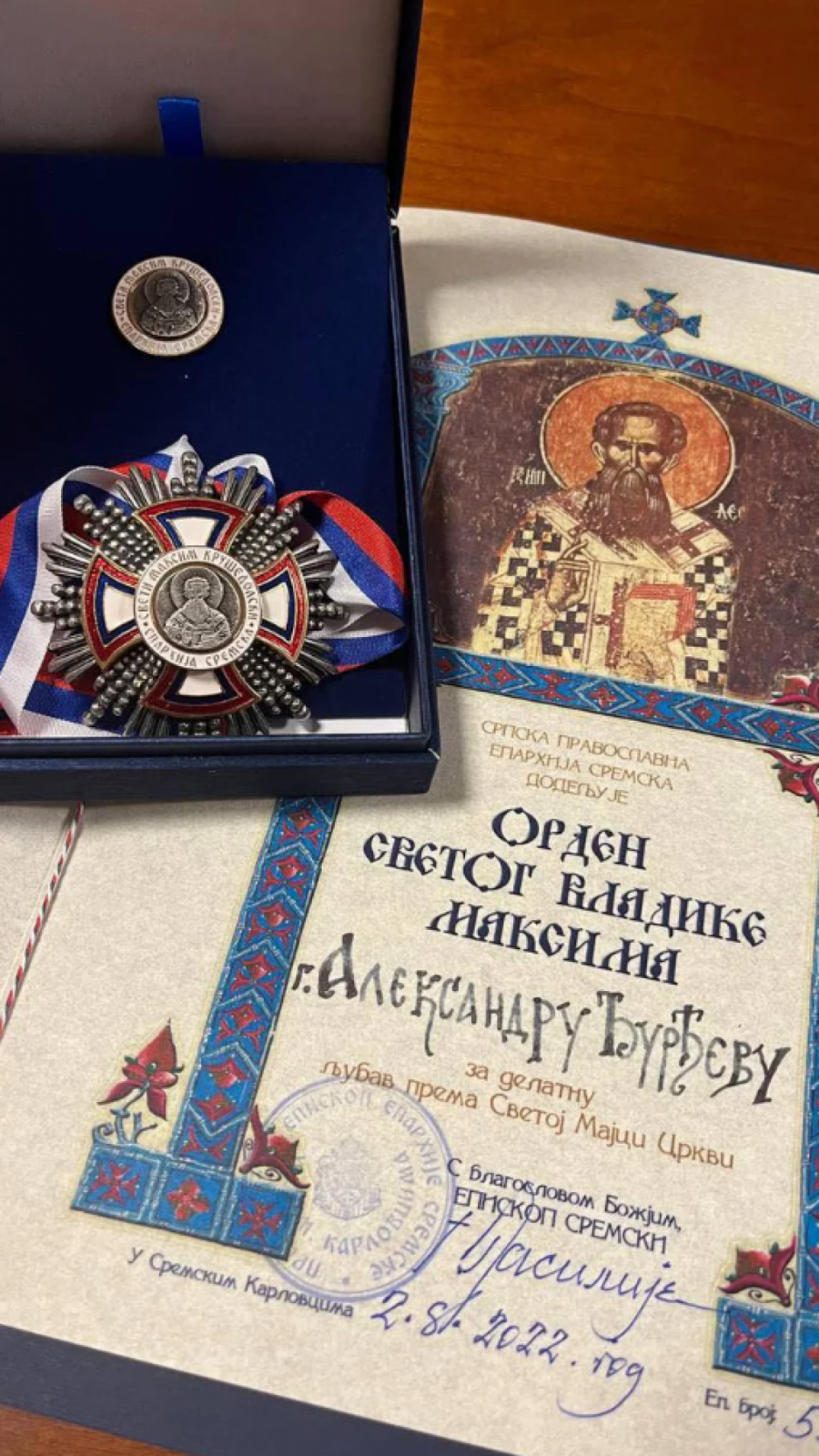 Orden Svetog Vladike Maksima Brankovića, Aleksandru Đurđevu, dodelila je Eparhija Sremska sa blagoslovom Episkopa Vasilija, a za za delatnu ljubav prema Svetoj Majci Crkvi.