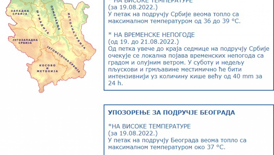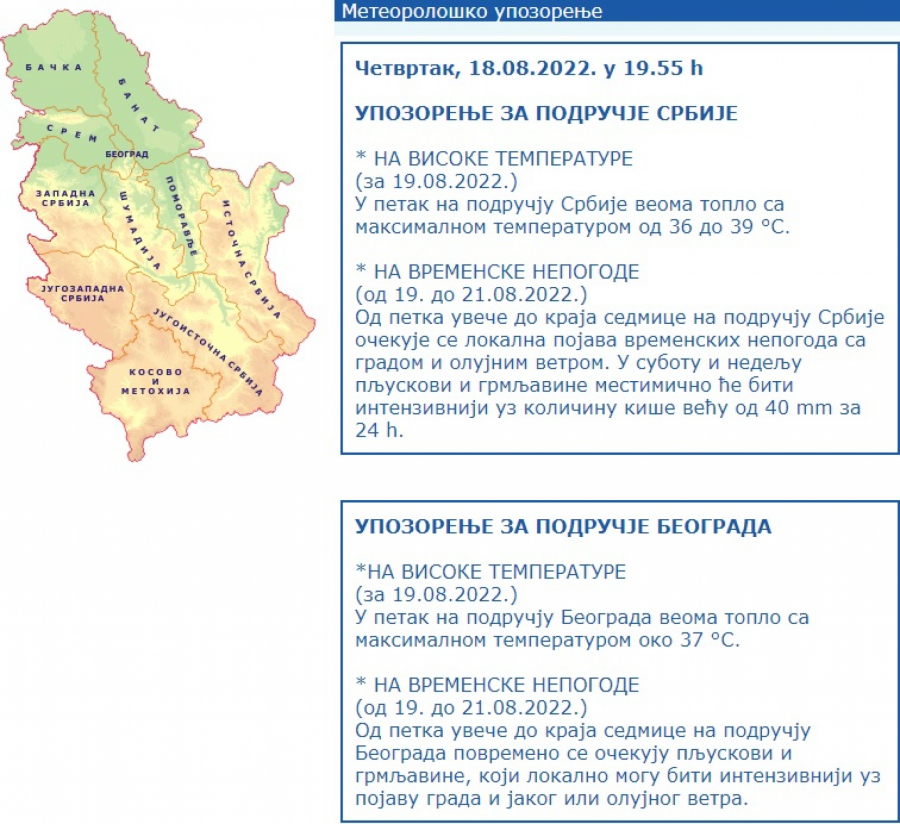 Danas će u Srbiji biti sunčano i veoma toplo. Posle podne u jugozapadnim krajevima uz lokalni razvoj oblačnosti pljuskovi sa grmljavinom, a uveče i tokom noći naoblačenje sa kišom, pljuskovima sa grmljavinom i kratkotrajnim vremenskim nepogodama praćene većom količinom padavina, gradom i jakim vetrom i to u zapadnim delovima zemlje.
