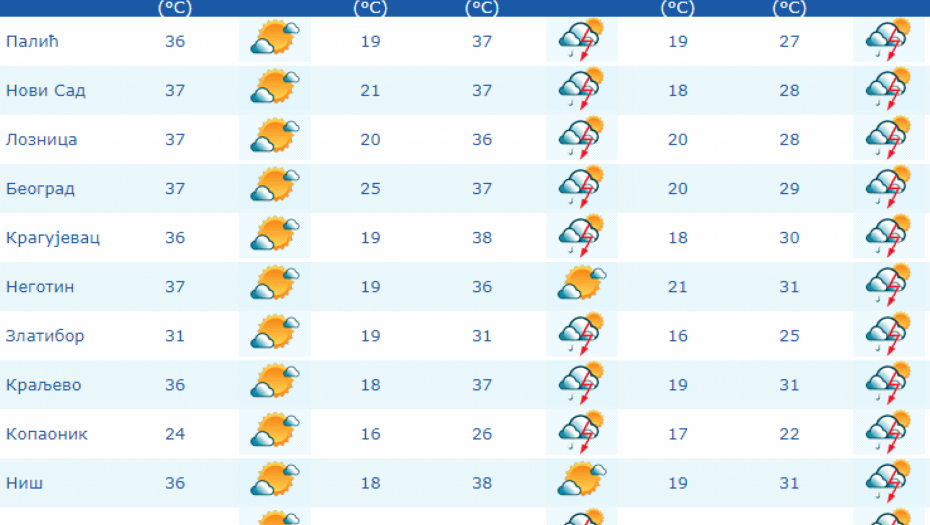 Najniža temperatura od 15 na jugu do 25 stepeni na severu, a najviša od 36 do 39 stepeni. U Beogradu sutra slično vreme, sa slabim jugoistočnim vetrom.