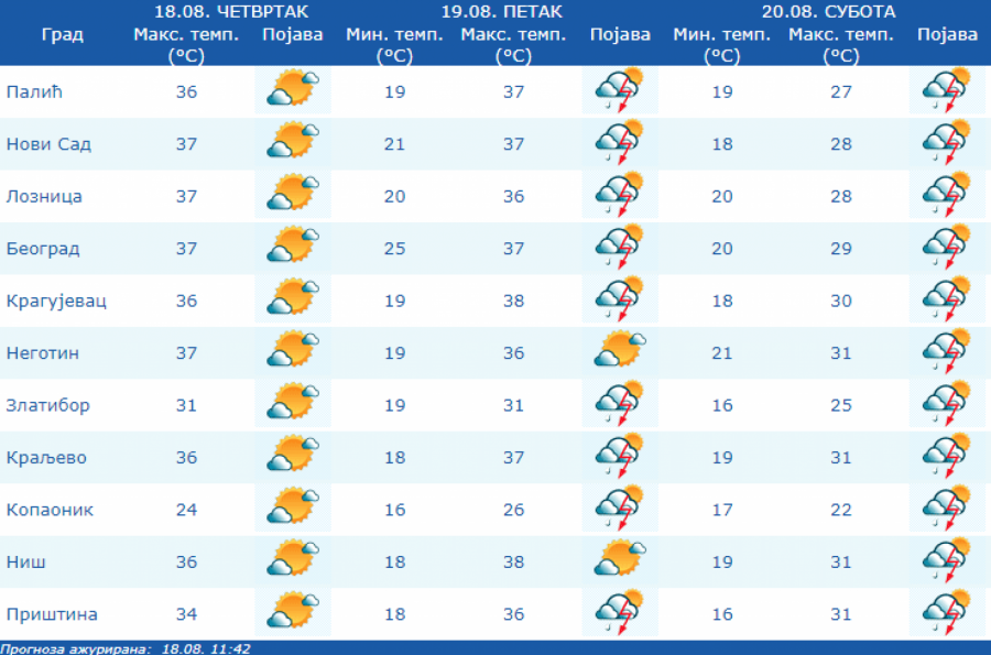 Najniža temperatura oko 25 stepeni, a najviša oko 37 stepeni. Maksimalna temperatura za vikend u većini mesta biće od 25 do 30 stepeni, navedeno je u saopštenju RHMZ.