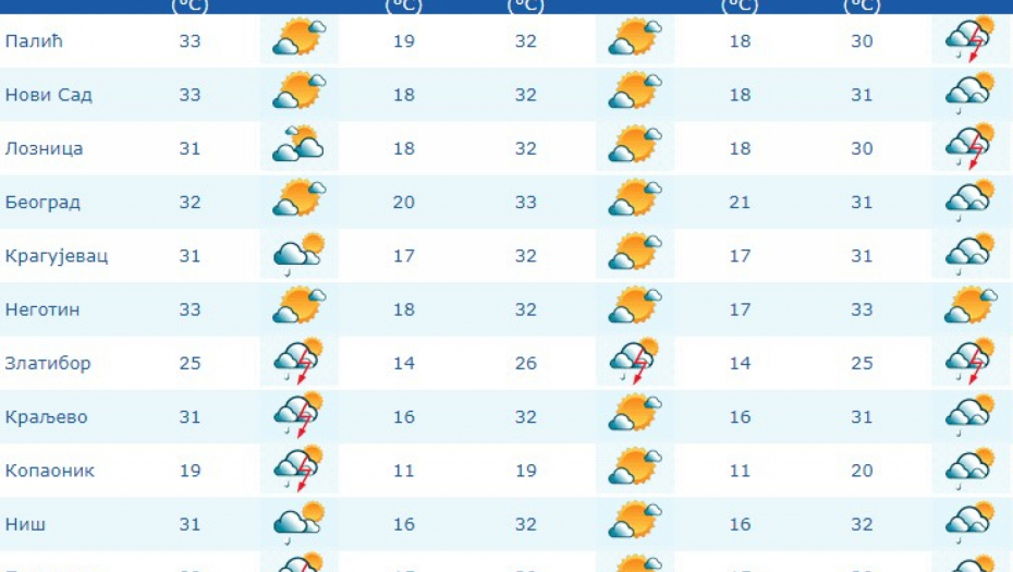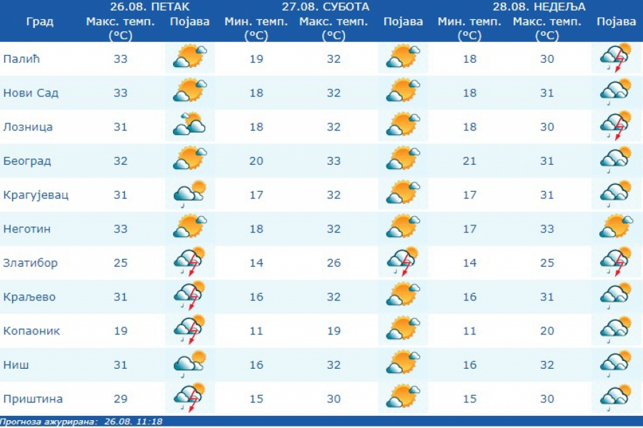 Što se današnjeg dana tiče, meteorolog kaže da će biti pretežno sunčano ali uz pojačan razvoj dnevne oblačnosti koja ponegde može usloviti pojavu grmljavinskih pljuskova, pretežno u brdsko-planinskom delu regiona. Vetar uglavnon slab, severozapadni, samo u zoni pljuskova na kratko jak. Dnevni maksimum od +24 do +31 stepena Celzijusa.