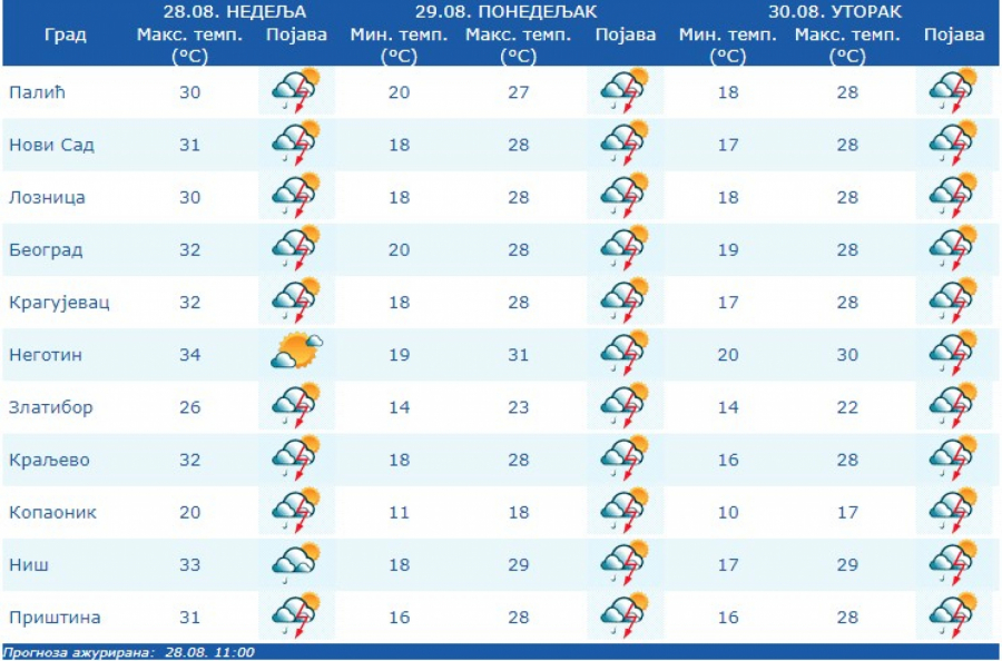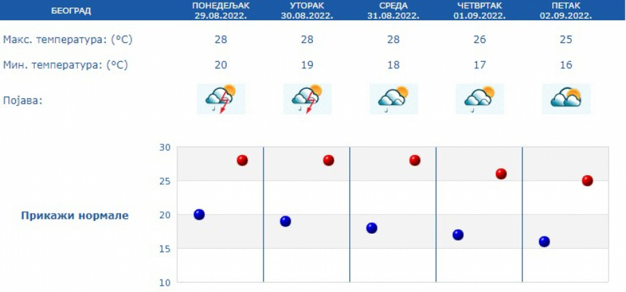 Prema izgledima vremena za narednih sedam dana, do nedelje, 4. septembra, biće promenljivo oblačno, nestabilno i sparno, sa lokalnim pljuskovima i grmljavinom.