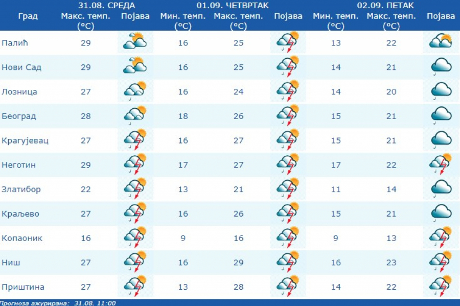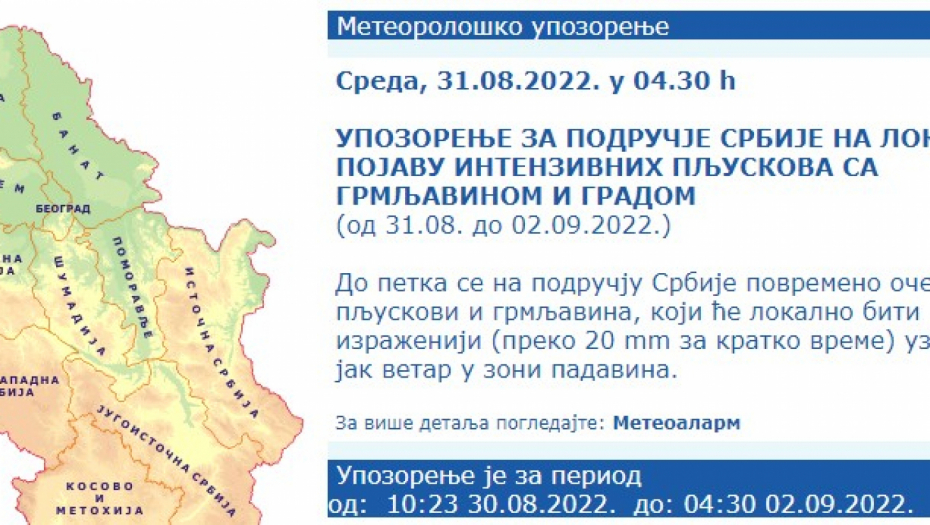 Kako je Zavod upozorio, deo zemlje će zahvatiti intenzivni pljuskovi sa grmljavinom i gradom.