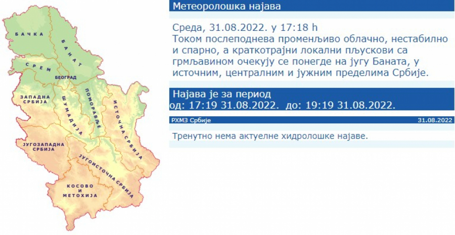 Kako je najavljeno, tokom poslepodneva biće promenljivo oblačno, nestabilno i sparno, a kratkotrajni lokalni pljuskovi sa grmljavinom očekuju se ponegde na jugu Banata, u istočnim, centralnim i južnim predelima Srbije.