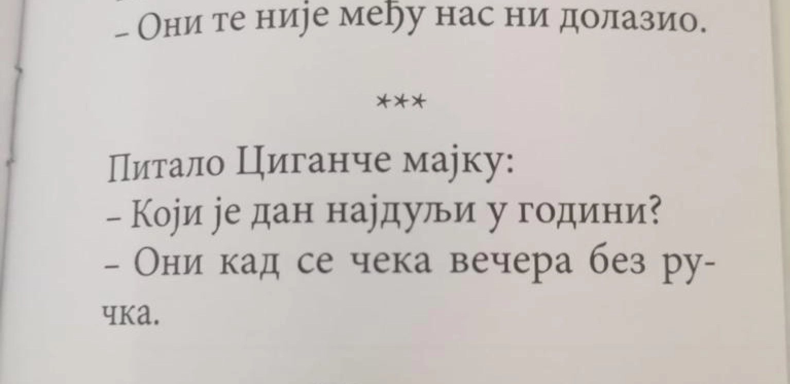 - Ovo je tragično za Srbiju iz više razloga. Pre svega, nepoštovanja prava nacionalne manjine jer naziv Rom je usvojen 1971. godine, a Romi su zvanično u Srbiji od 2002. godine nacionalna manjina. Zašto se u udžbenicima i dalje nazivamo ‘Ciganima’? Ovakvo podsticanje stereotipa i diskriminacije deci od devet godina je pokazatelj mnogo ozbiljnijeg problema. Etnička pristrasnost u udžbenicima i nastavnim planovima i programima protiv Roma je sistemski problem“, ocenjuje pokret.