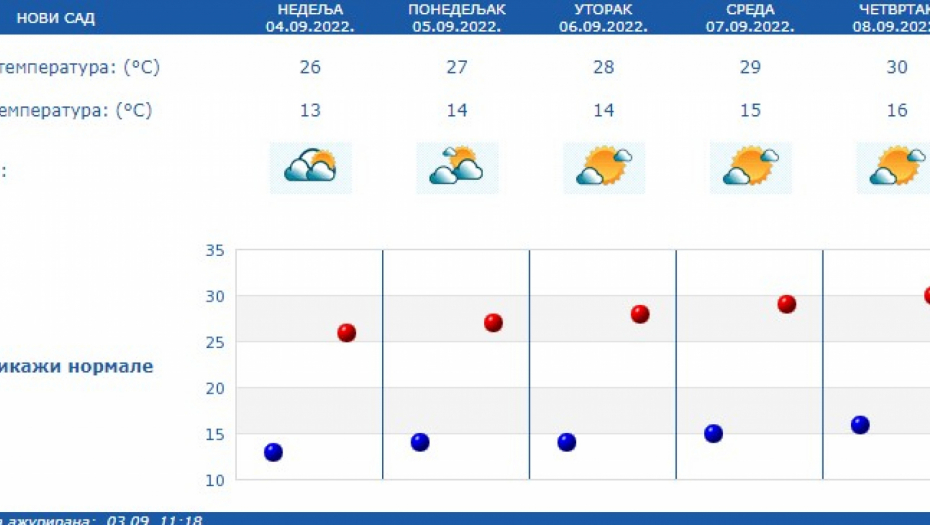 Minimalna temperatura u noći sa subote na nedelju bila je 13 stepeni, dok će se maksimumi kretati od 27 do 29 stepeni Celzijusa.