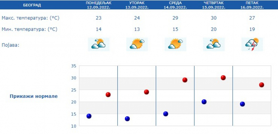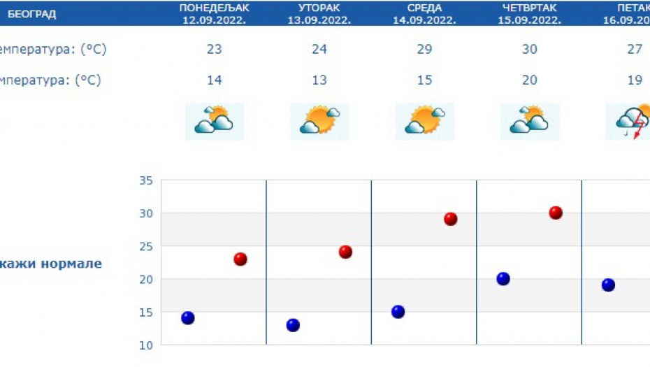 - Sreda, četvrtak i petak doneće za 5 do 7 stepeni više temperature od proseka, ali ne zadugo, jer se već za sledeći vikend očekuje drastičan pad i one će biti i za 5 stepeni ispod prosečnih vrednosti. Dakle, dani od sredine sedmice će nas podsetiti da leto kalendarski još tu, ali sledeći vikend će nas upozoriti i da smo na korak od jeseni - stoji u vremenskoj prognozi za narednu nedelju.