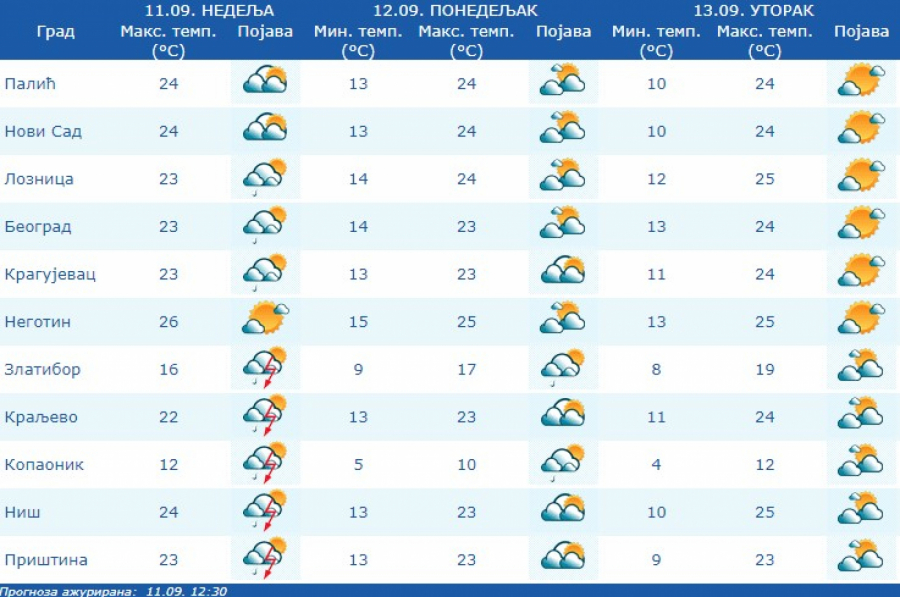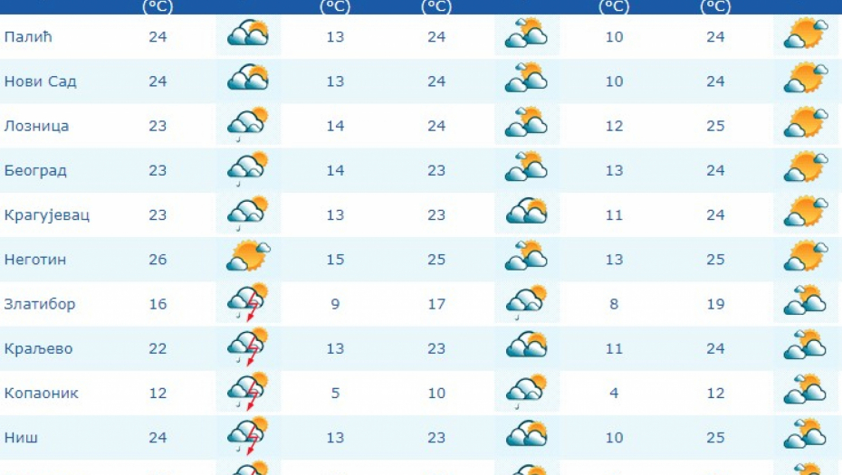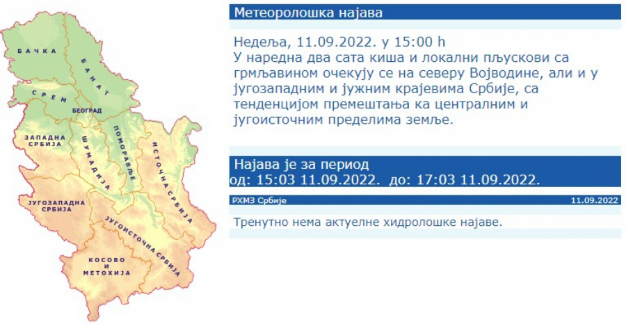 - Tokom narednog vikenda u Srbiji se očekuje pravo jesenje vreme. Biće umereno do pretežno oblačno sa kišom, pljuskovima i grmljavinom, uz drastičan pad temperature, zbog prodora veoma hlande vazdušne mase sa severa iza hladnog fronta. Uz pojačan severozapadni vetar, maksimalna temperatura biće od 16 do 24°C, u nedelju uglavnom ispod 20°C - navodi Đurić.