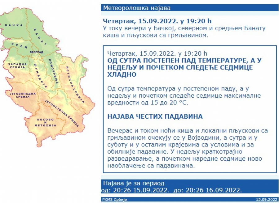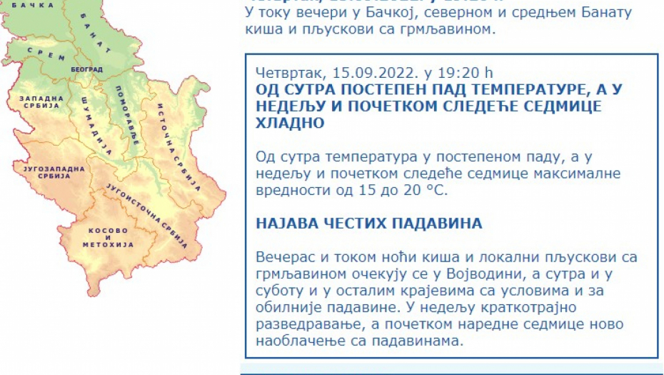 Od sutra temperatura u postepenom padu, a u nedelju i početkom sledeće sedmice maksimalne vrednosti od 15 do 20 °C, stoji u najavi RHMZ.