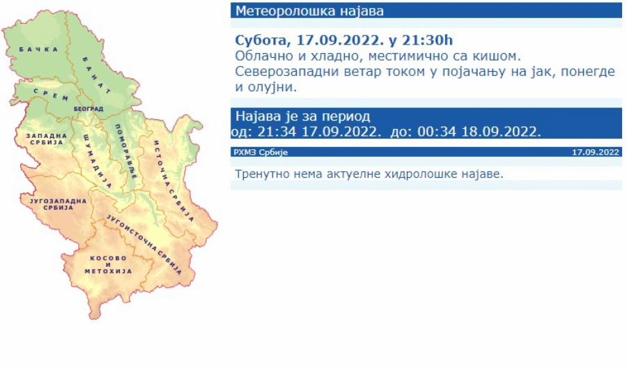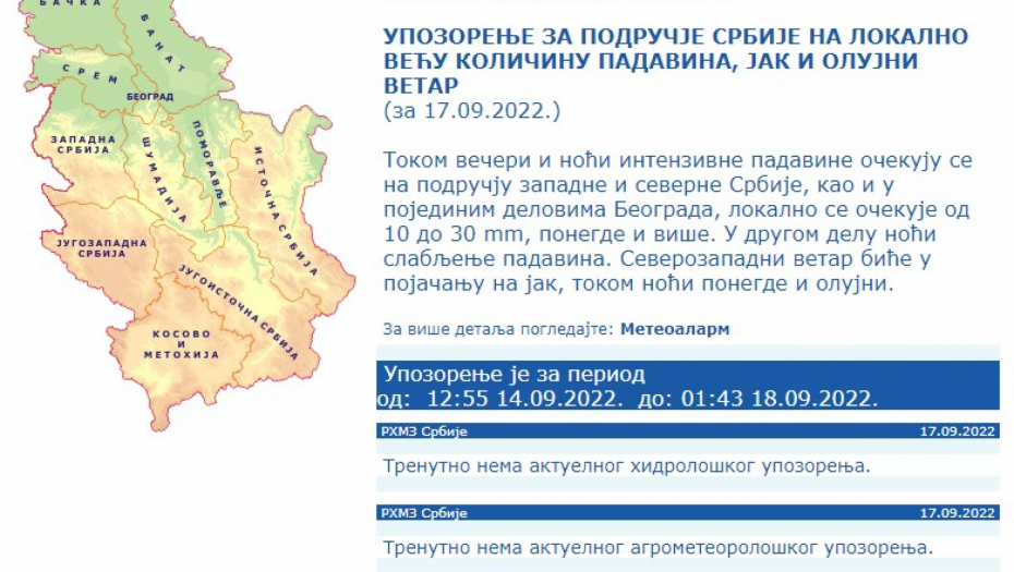 Republički hidro-meteorološki zavod (RHMZ) upozorio je da se tokom večeri i noći očekuju intenzivne padavine na području zapadne i severne Srbije, kao i u pojedinim delovima Beograda.