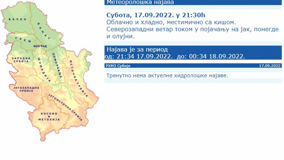 "U drugom delu noći slabljenje padavina. Severozapadni vetar biće u pojačanju na jak, tokom noći ponegde i olujni", naveo je RHMZ.