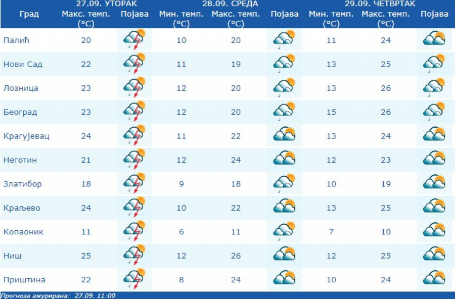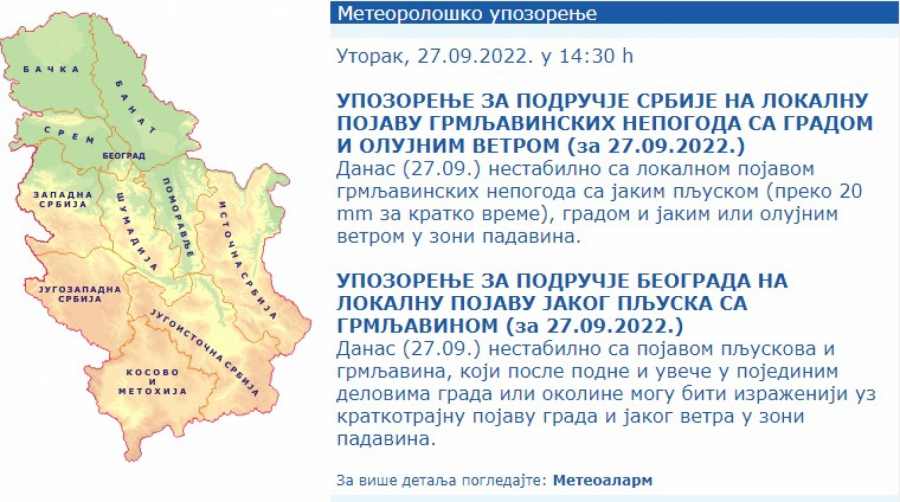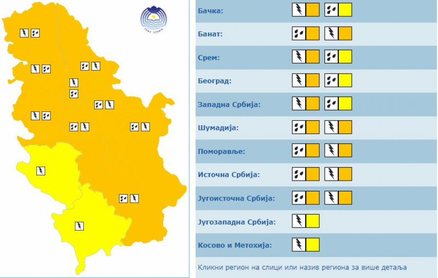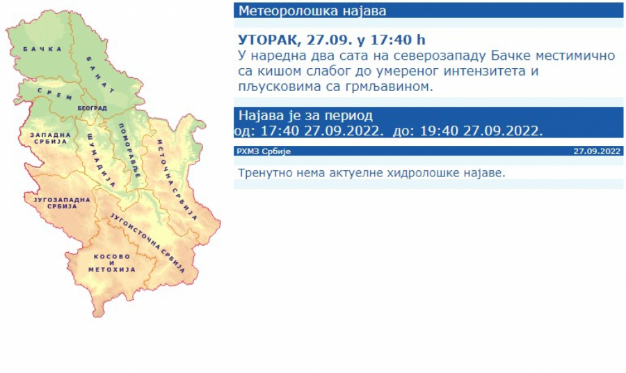 - U naredna dva sata u južnim delovima Banata, Braničevskom okrugu, Pomoravlju i na istoku Srbije mestimično sa kišom slabog i umerenog intenziteta, pljuskovima sa grmljavinom i pojačanim vetrom - saopšteno je na sajtu RHMZ-a u 16.30 sati.