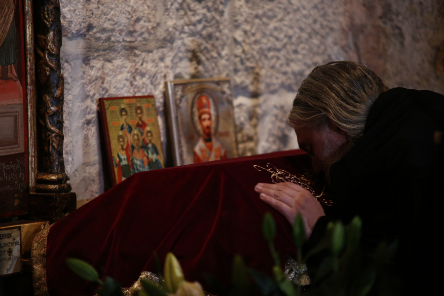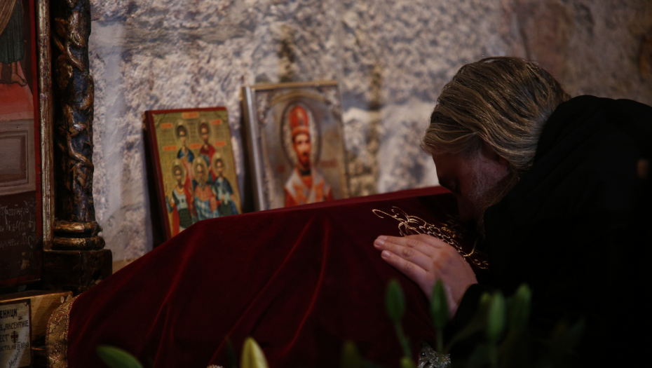 Ispred manastira se nalazi veliki video bim. Vernici koji su došli sa svih strana ulazili su u crkvu, da celivaju mošti srpskih patrijaraha.