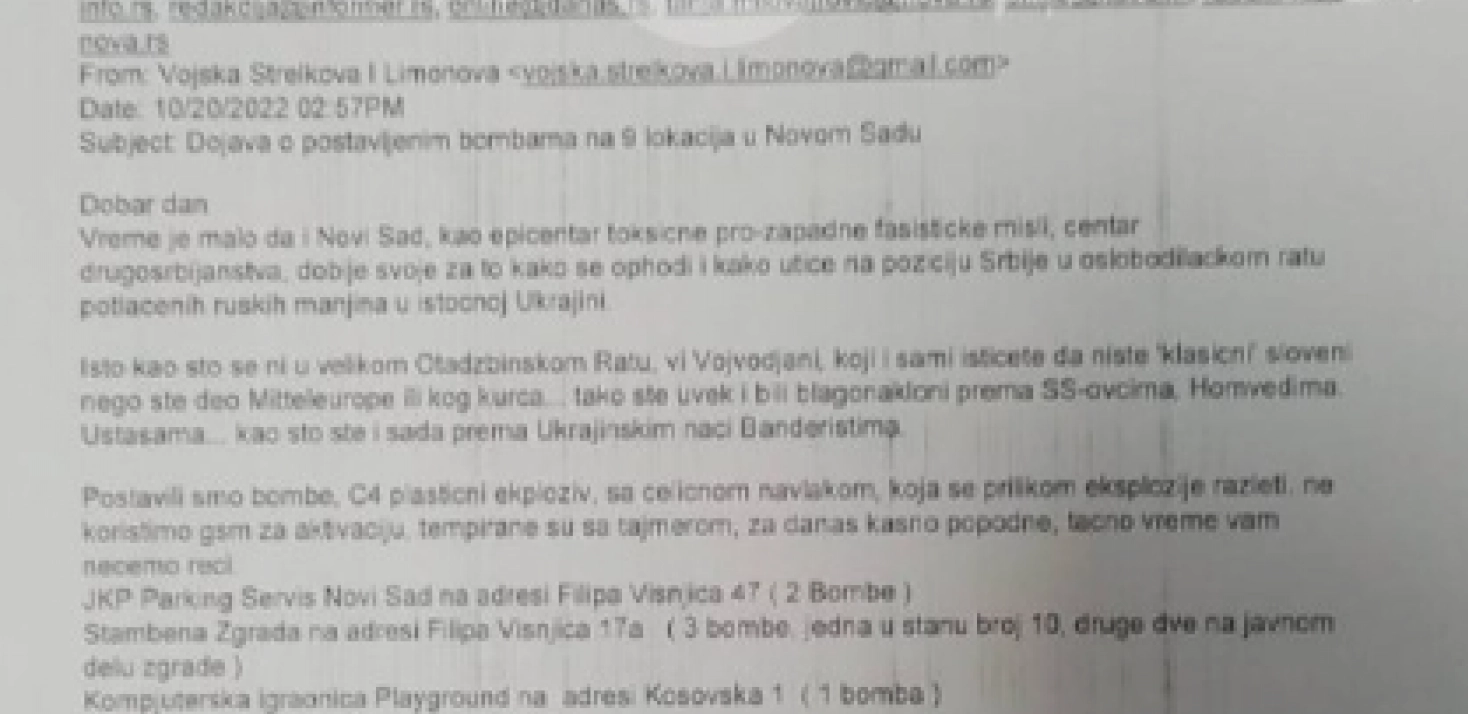 - Isto kao što se ni u velikom Otadžbinskom Ratu, vi Vojvođani, koji i sami ističete da niste "klasični" sloveni nego ste deo Mitteleurope ili kog kur**... tako ste uvek i bili blagonakloni prema SS-ovcima, Homvedima. Ustašama... kao što ste i sada prema Ukrajinskim naci Banderistima. Postavili smo bombe, C4 plastični ekploziv, sa čeličnom navlakom, koja se prilikom eksplozije razleti. Ne koristimo gsm za aktivaciju, tempirane su sa tajmerom, za danas kasno popodne, tačno vreme vam nećemo reći - piše u jezivoj pretećoj poruci koja je stigla sa adrese u potpisu "Vojska Strelkova i Limonova".