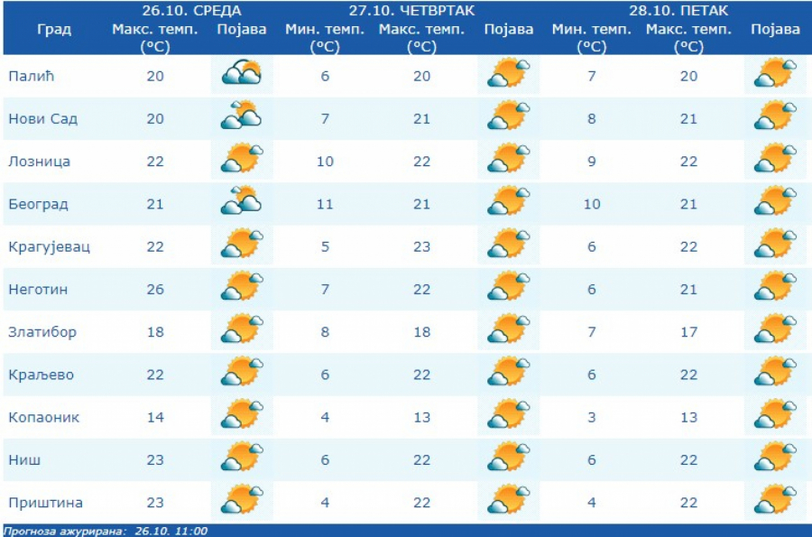 - U predelima bez magle oni bi trebalo da se kreću od 14 do 21 stepen, na jugu i oko 25 stepeni Celzijusa, a u mestima sa maglom oko 13 stepeni. Početak novembra donosi nastavak sinoptike iz oktobra gde će uz dominaciju anticiklona preovlađivati suvo i stabilno vreme - piše Čubrilo.