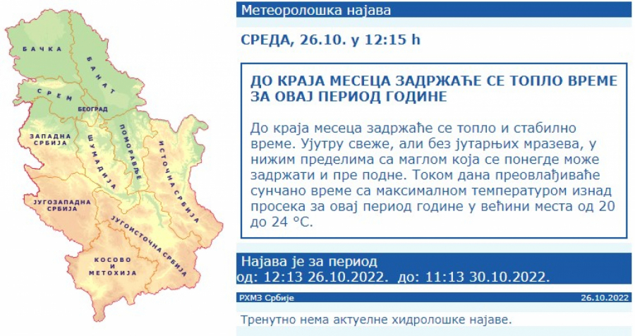 Do kraja meseca i početkom novembra uz dominaciju anticiklona biće suvo, stabilno i relativno toplo vreme uz moguću pojavu magle i njeno duže zadržavanje, objavio je meteorolog Marko Čubrilo.