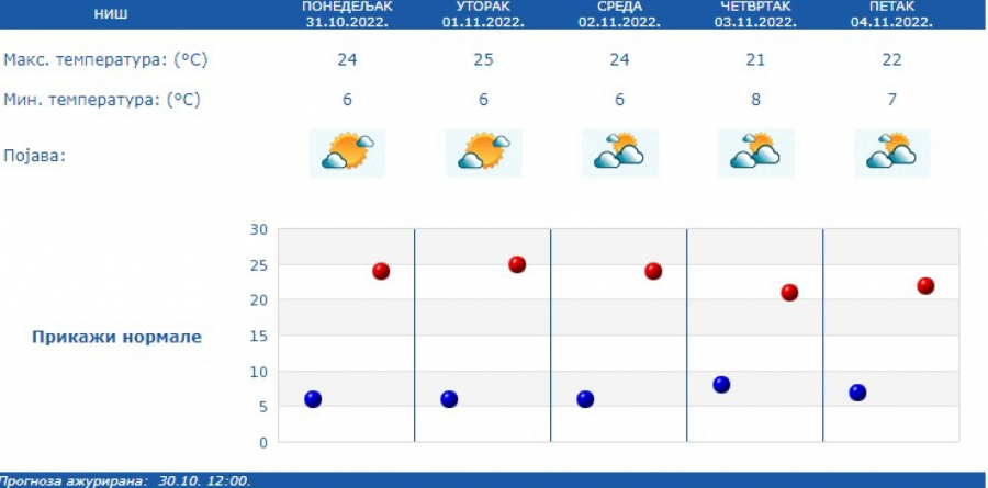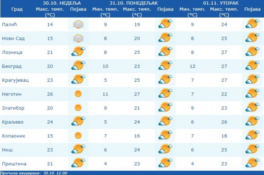U Srbiji u utorak ujutru po kotlinama kratkotrajna magla, a u dana toku sunčano i toplo. U košavskom području će duvati umeren, a na jugu Banata kratkotrajno i jak jugoistočni vetar. Najviša temperatura od 22 do 28 stepeni.