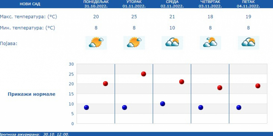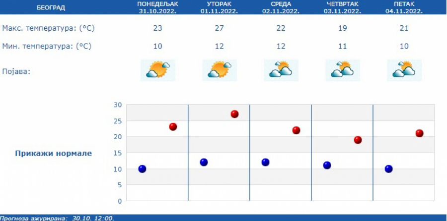 Od srede, 2.novembra, pa do 7.novembra, malo do umereno oblačno, ali suvo. Dnevna temperatura će biti u manjem padu, ali i dalje iznad proseka za ovo doba godine. Košava će duvati u petak, 4.novembra.