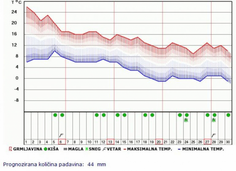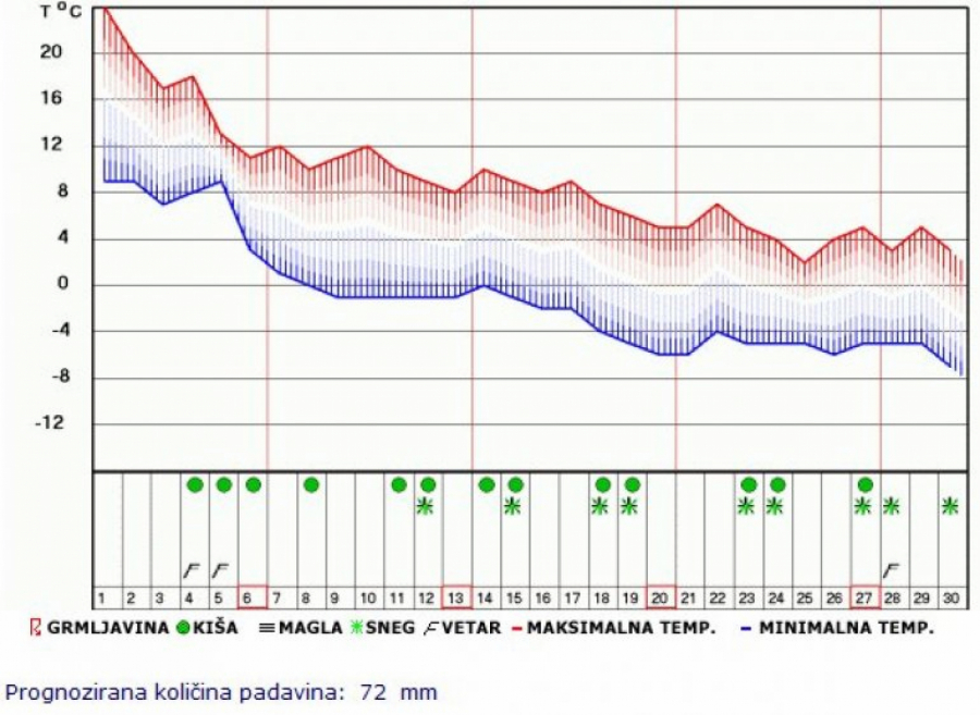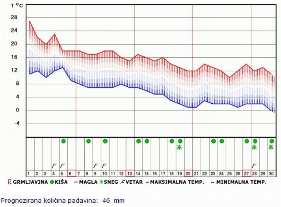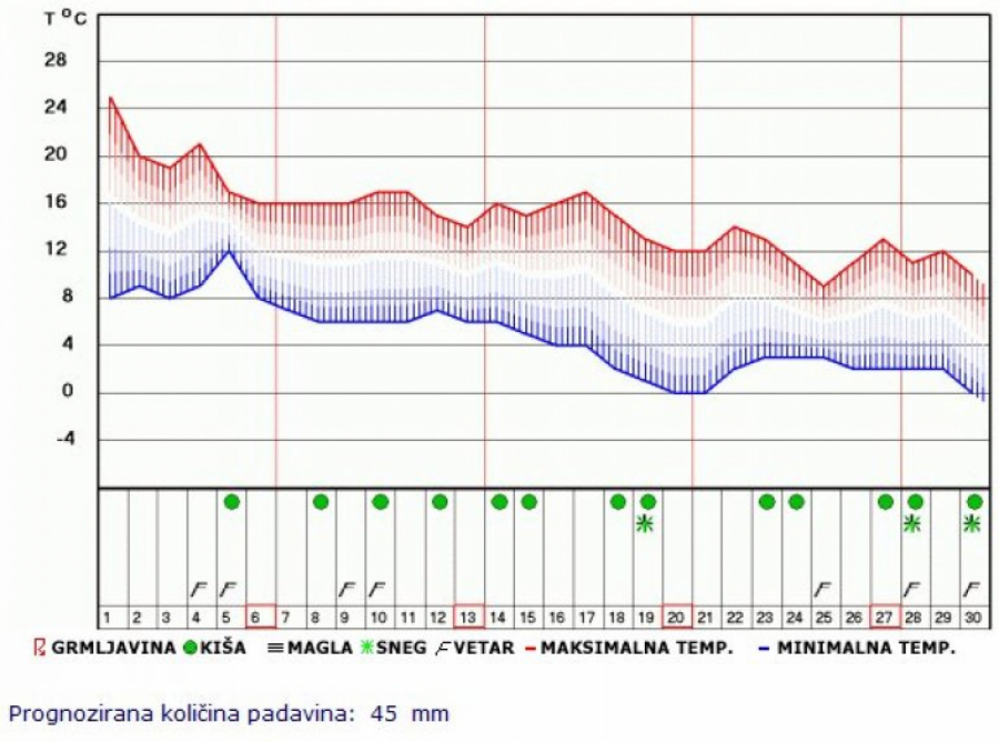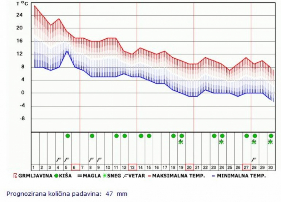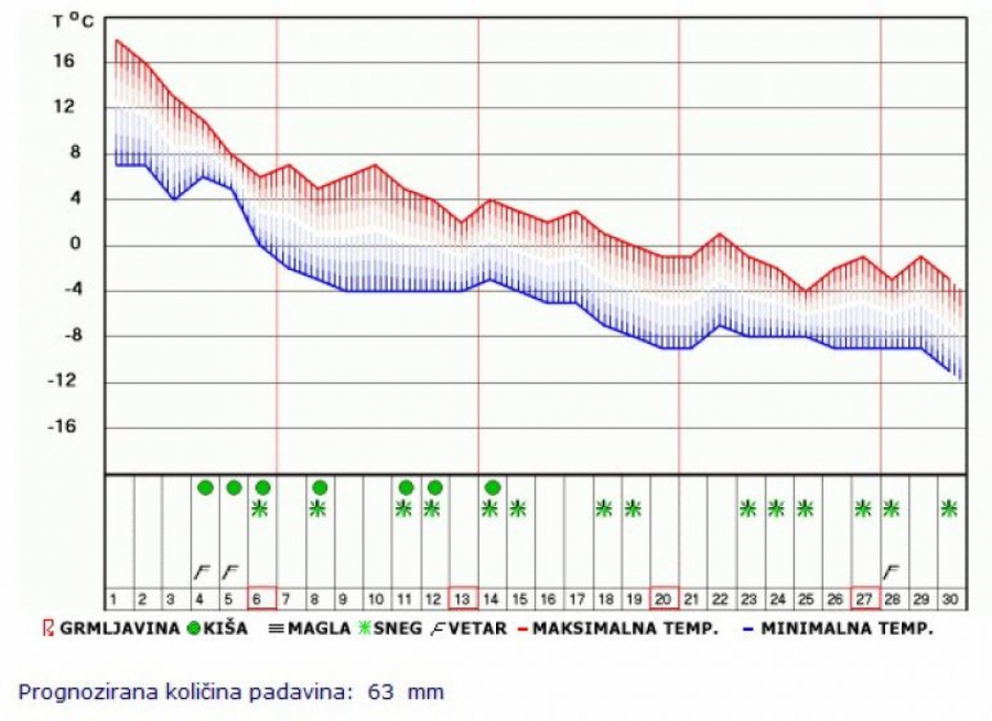 Po mesečnoj prognozi RHMZ-a, temperatura će biti u stalnom padu, dok se sneg u Beogradu, kao i u Novom Sadu i Kragujevcu očekuje 19. novembra.