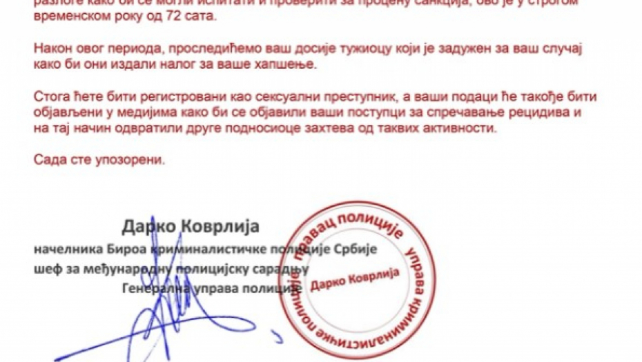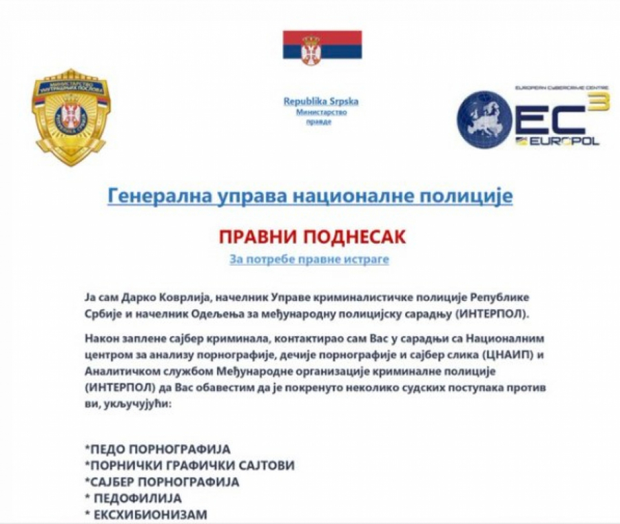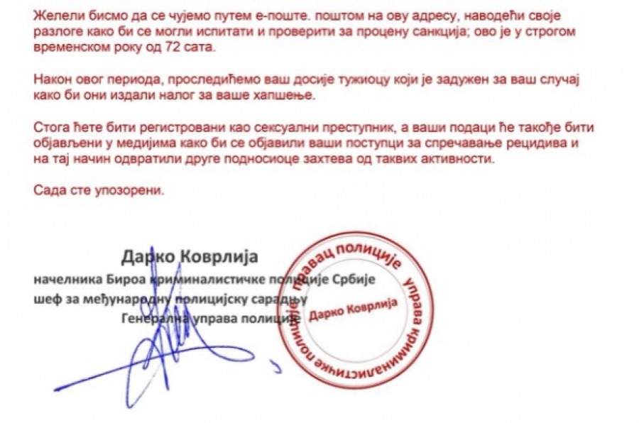 "Zdravo, u prilogu potražite poziv koji vas se tiče. S poštovanjem, Darko Kovrlija, načelnik Republičke uprave Kriminalističke policije Srbije. Ja sam Darko Kovrlija, načelnik Uprave kriminalističke policije Republike Srbije i načelnik Odeljenja za međunarodnu Odeljenja za međunarodnu policijsku saradnju (Interpol). Nakon zaplene sajber kriminala, kontaktirao sam Vas u saradnji sa Nacionalnim centrom za analizu pornografije, dečije pornografije i sajber slika (CNAIP) i Analitičkom službom Međunarodne organizacije kriminalne policije (INTERPOL) da Vas obavestim da je pokrenuto nekoliko sudskih postupaka protiv Vas, uključujući: Pedo pornografija, pornički grafički sajtovi, sajber pornografija, pedofilija, ekshibionizam. Želeli bismo da se čujemo putem e-pošte, poštom na ovu adresu, navodeći svoje razloge kako bi se mogli ispitati i proveriti za procenu sankcija: ovo je u strogom vremenskom roku od 72 sata. Nakon ovog perioda, prosledićemo vaš dosije tužiocu koji je zadužen za vaš slučaj kako bi oni izdali nalog za vaše hapšenje. Stoga ćete biti registrovani kao seksualni prestupnik, a vaši podaci će takođe biti objavljeni u medijima kako bi se objavili vaši postupci za sprečavanje recidiva i na taj način odvratili druge podnosioce zahteva od takvih aktivnosti. Sada ste upozoreni", navodi se u poruci.