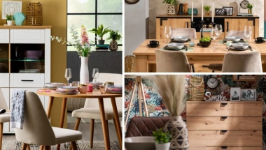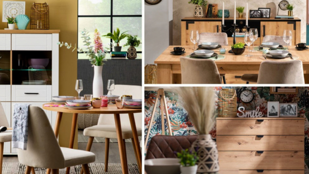 Ukoliko je trpezarija veće kvadrature, u obzir dolazi i veći sto sa opcijom proširenja radne površine, a odličan izbor je trpezarijski sto OSCAR, u artisan hrast dezenu. Trpezarijske stolice DC-232 sa štofom u boji peska, kao i nogarima u crnoj metalnoj konstrukciji sjajan su dodatak. Ljubiteljima kombinacije drvo dekora i crnih detalja dopašće se komoda LAZIO 3K3F iz istoimene kolekcije, u dekoru artisan hrasta i dekorativnih detalja u vidu metalnih okova, koja će se uklopiti u ostatak ambijenta. Uz par dekorativnih elemenata, poput crnog elegantnog svećnjaka i činija za serviranje, zaokružićete jedan sjajan stilski opremljen ambijent.