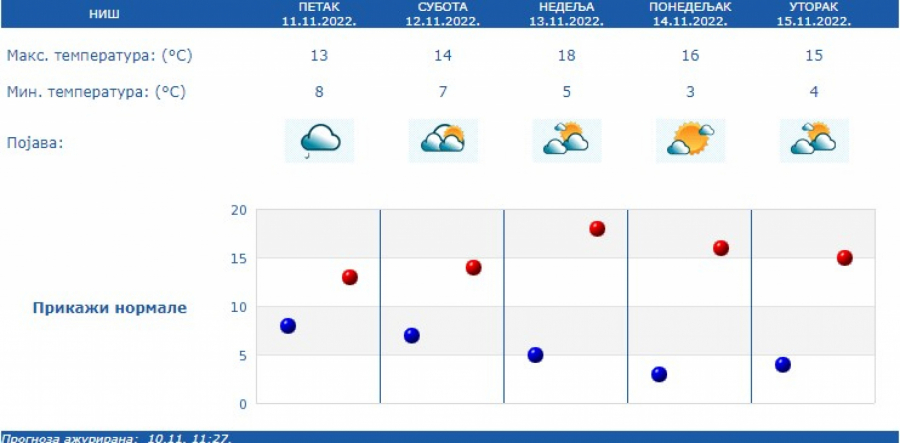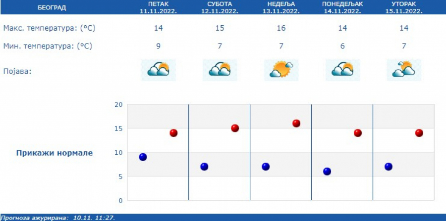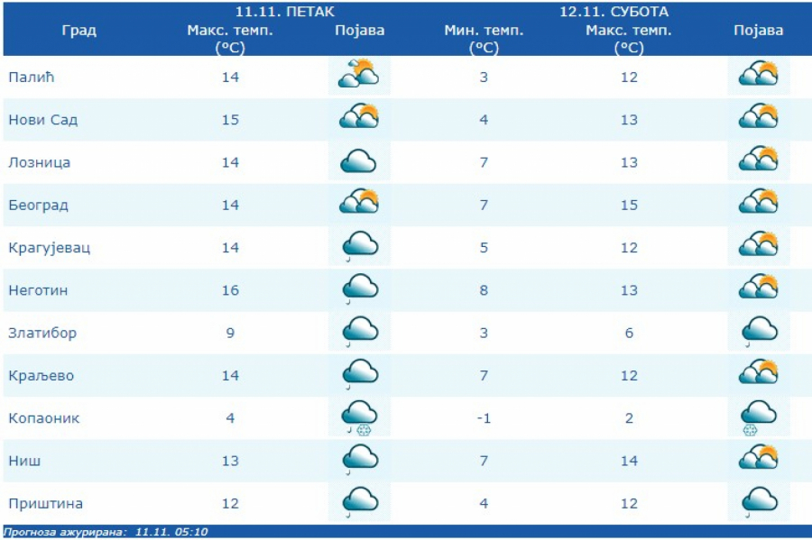 Najniža temperatura od 7 do 9 stepeni, a najviša oko 14 stepeni. Sutra ujutro ponegde kratkotrajna magla.