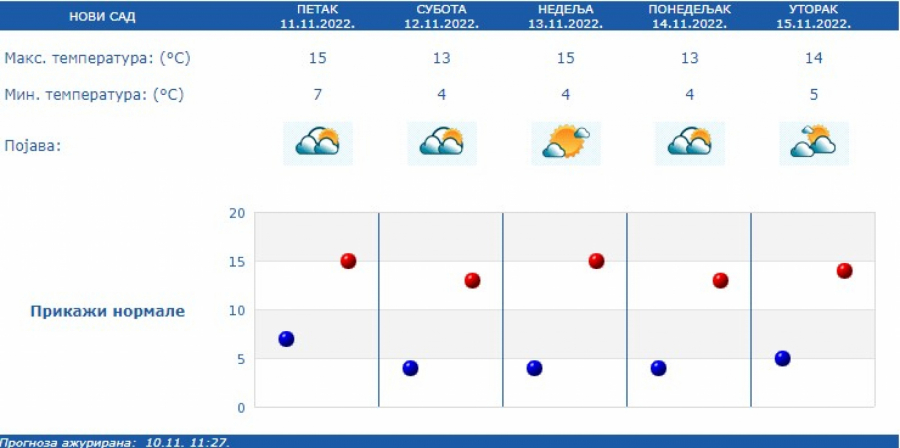 U utorak se očekuje malo do umereno oblačno i suvo, u košavskom području uz umeren i jak jugoistočni vetar. Od srede naoblačenje i zahlađenje s kišom, na planinama sa snegom.