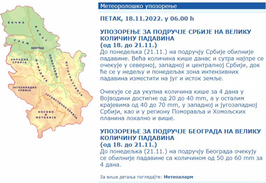 - Više padavina u subotu očekuje se u severnoj, zapadnoj i centralnoj Srbiji, dok će se u nedelјu zona intenzivnih padavina izmestiti na jug i istok zemlјe - piše na sajtu RHMZ-a.