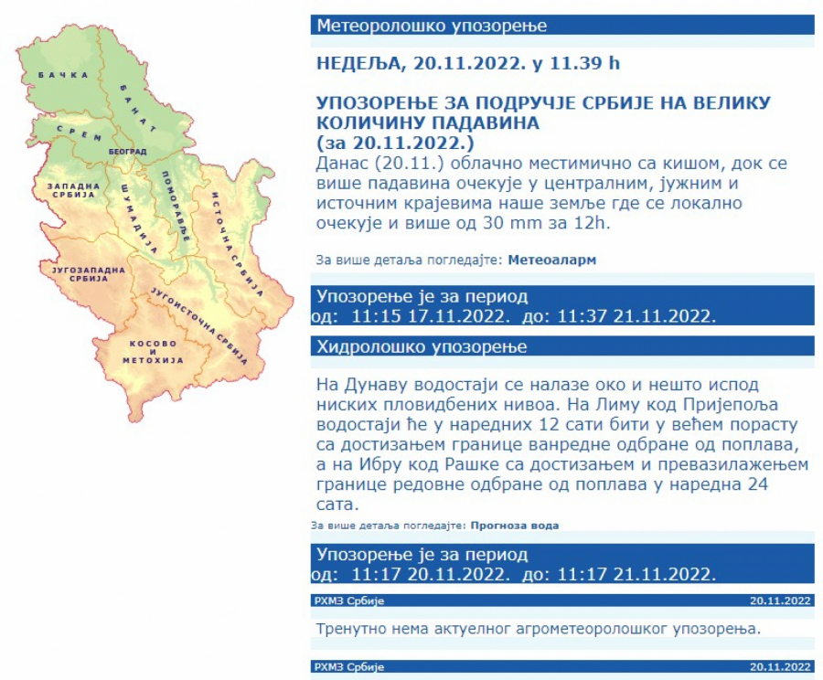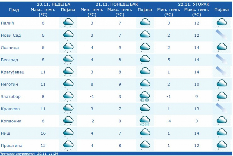 U nedelju i ponedeljak (20 - 21.11.) oblačno mestimično sa kišom, dok se više padavina očekuje u centralnim, južnim i istočnim krajevima naše zemlje gde se lokalno očekuje i više od 30 mm za 12h.