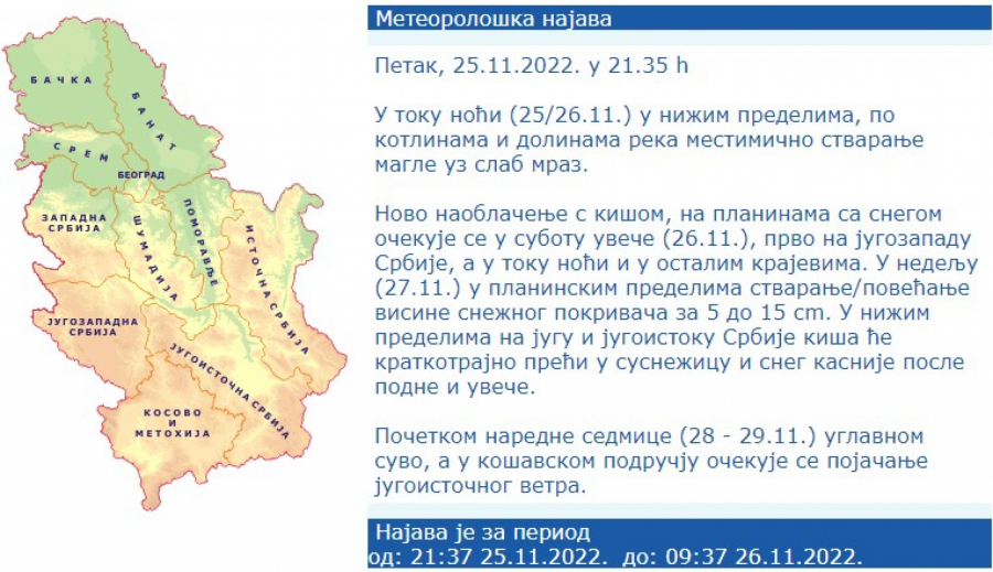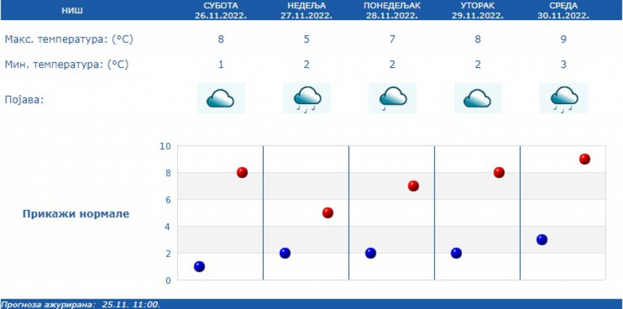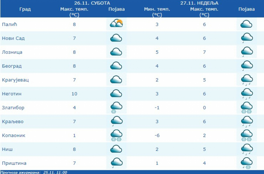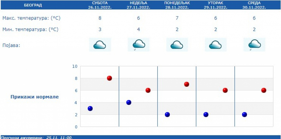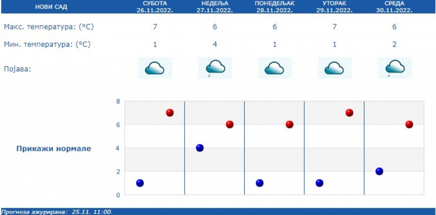 Prema prognozi vremena za narednih sedam dana, do subote, 3. decembra, u nedelju oblačno, na severu uglavnom suvo, u ostalim krajevima mestimično sa kišom i susnežicom u nižim, a sa snegom u višim predelima.