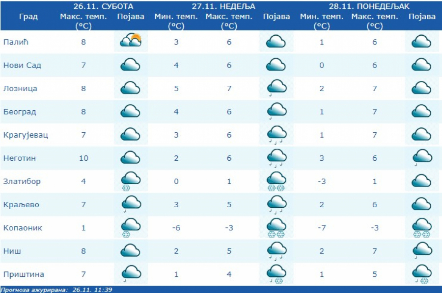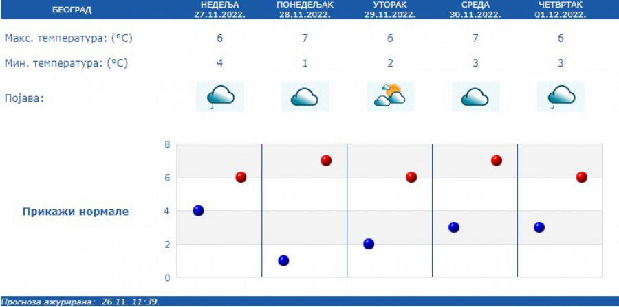 I u Beogradu ujutro magla ili niska oblačnost. Tokom dana oblačno, povremeno sa slabom, kratkotrajnom kišom ili rosuljom. Vetar slab, severnih pravaca. Temperatura bez većeg kolebanja od 4 do 6 stepeni.