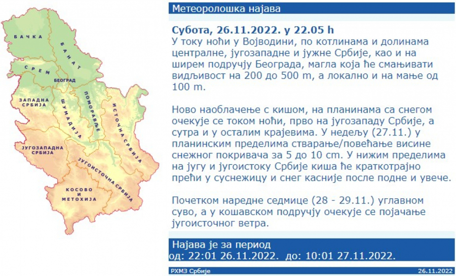 U Srbiji će danas maglovito jutro, tokom dana oblačno, u nižim predelima mestimično sa kišom, na jugu i jugoistoku Srbije ponegde i sa susnežicom i snegom.