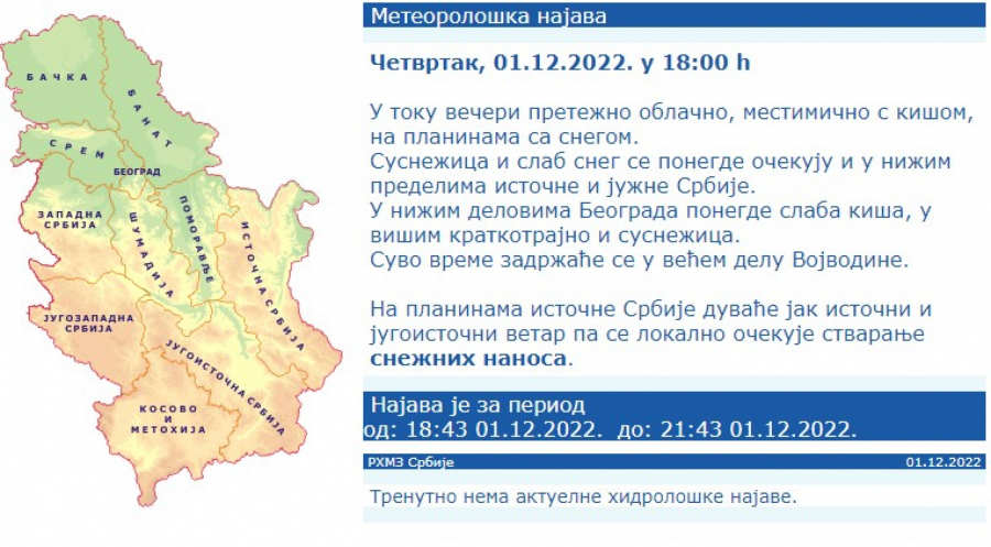 Na planinama istočne Srbije duvaće jak istočni i jugoistočni vetar, pa se lokalno očekuje stvaranje snežnih nanosa.