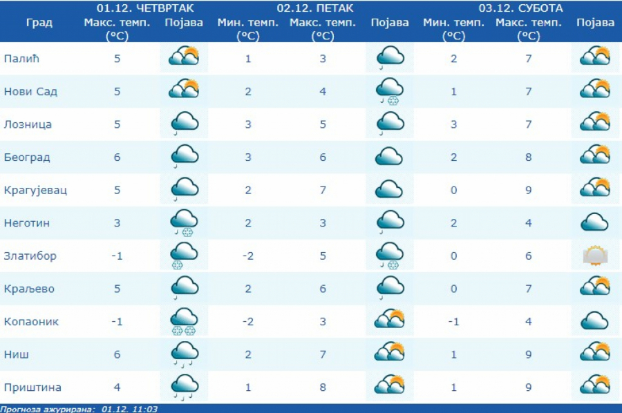 U Srbiji će do 8. januara pretežno oblačno, u petak na zapadu i severu ponegde sa slabom kišom, u subotu iznad većeg dela uglavnom suvo.