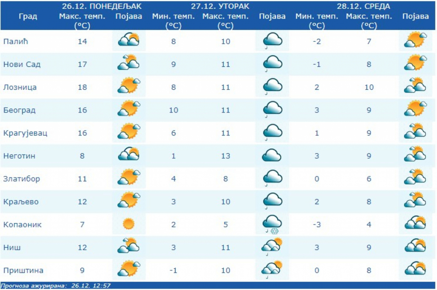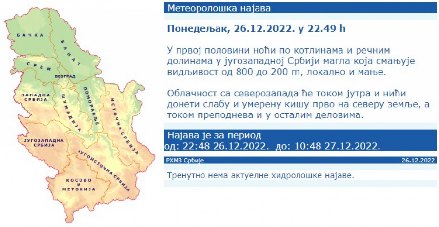Uveče i tokom noći prestanak padavina i u većini ostalih krajeva. Jutarnja temperatura od -1 do 10, najviša dnevna od 10 do 13 stepeni, saopštio je RHMZ.