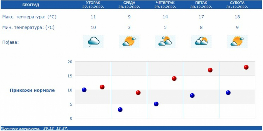 Zatim malo i umereno oblačno i postepeno toplije. Uz više oblačnosti slaba kiša očekuje se ponegde u petak na severu Srbije.
