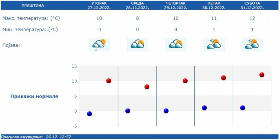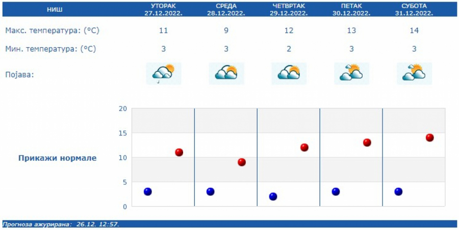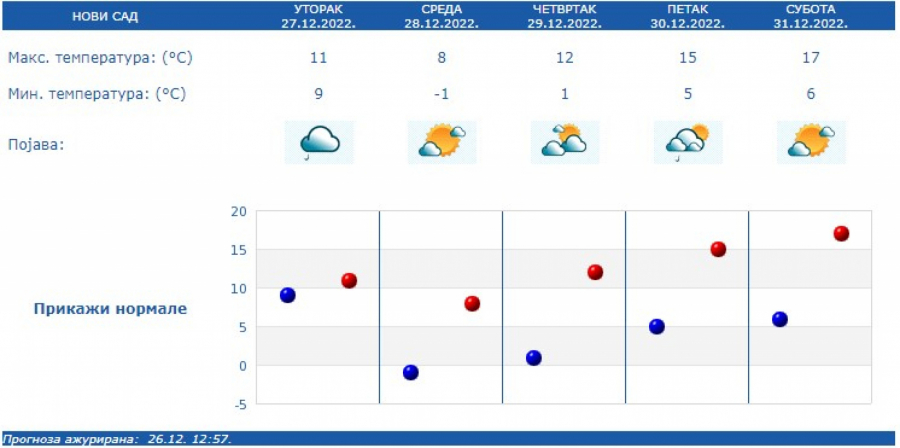 Dnevna temperatura bez većeg kolebanja oko 11 stepeni, posle podne u daljem padu. Duvaće slab i umeren severozapadni vetar.