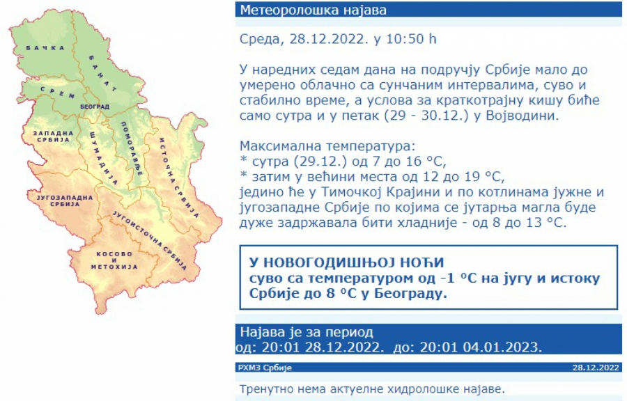 Prema prognozi RHMZ, danas se u Srbiji ujutro očekuje mestimično slab mraz i magla, koja će se ponegde po kotlinama i dolinama reka na jugu i jugozapadu Srbije zadržati duže tokom dana.
