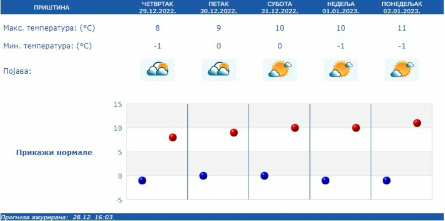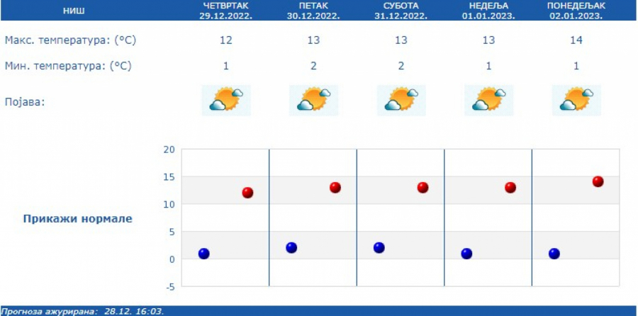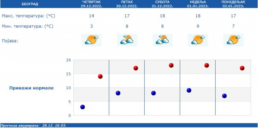 Vetar slab i umeren, južni i jugoistočni. Najniža temperatura od -3 do 3 stepena, a najviša od 7 stepeni u Timočkoj Krajini i po kotlinama u kojima se očekuje duže zadržavanje magle do 16 stepeni na zapadu Srbije.