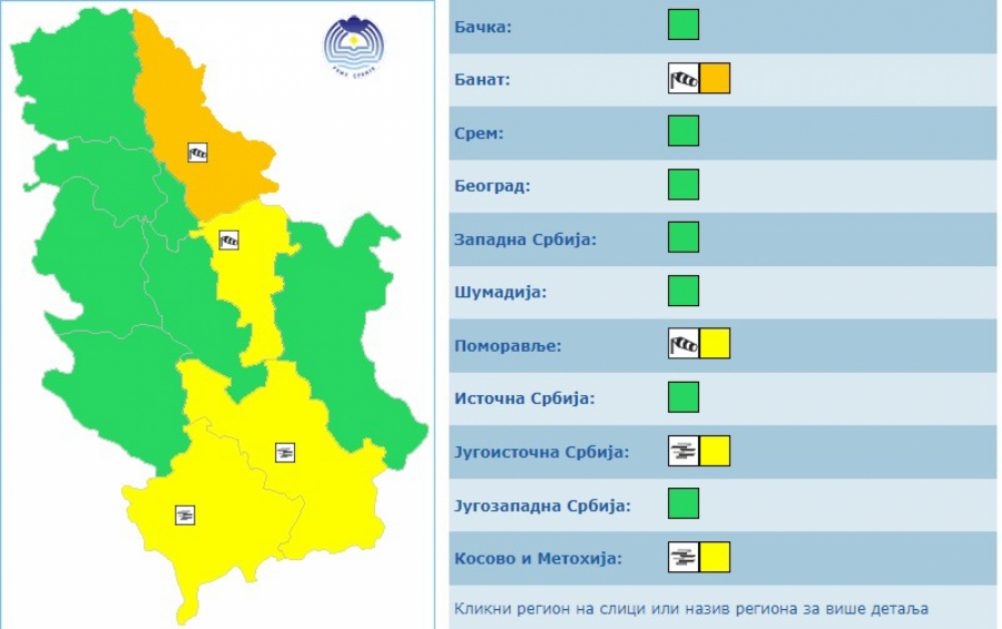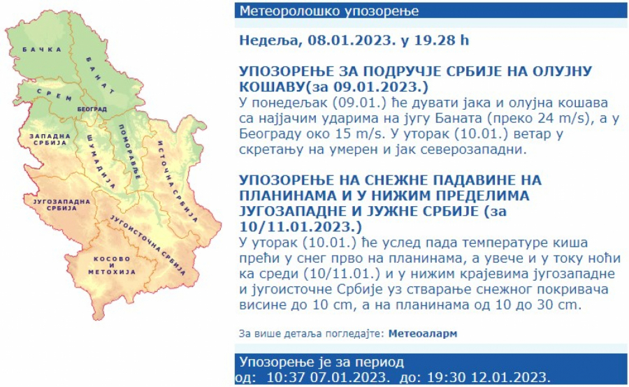 U utorak će usled pada temperature kiša preći u sneg prvo na planinama, a uveče i u toku noći ka sredi i u nižim krajevima jugozapadne i jugoistočne Srbije uz stvaranje snežnog pokrivača visine do 10 centimetara, a na planinama od 10 do 30 cm.