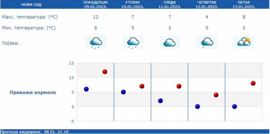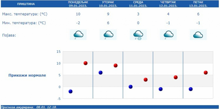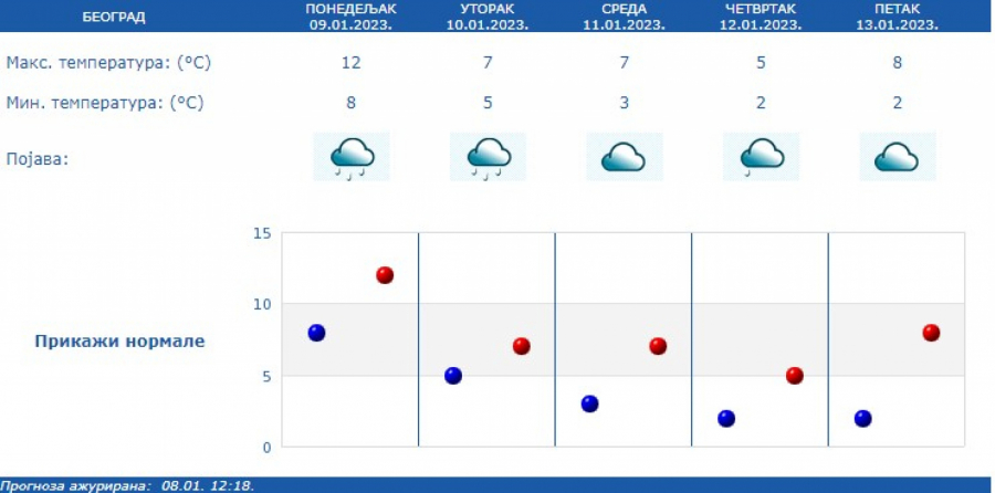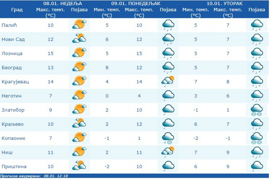 Jutarnja temperatura iznosiće od -2 stepena Celzijusa na jugu i jugoistoku do 10 stepeni na jugu Banata, a najviša dnevna u većini mesta od 10 °C do 15 °C, samo u Timočkoj Krajini hladnije oko 4 °C, saopštio je Republički hidrometeorološki zavod.