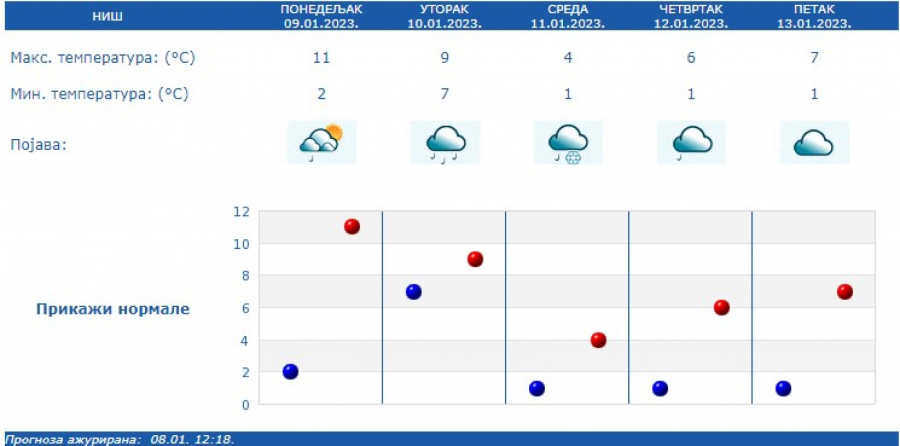 U sredu, 11. januara umereno do potpuno oblačno, suvo i hladnije uz slabljenje vetra, a mešovite padavine, kiša i sneg, očekuju se samo još ujutro i pre podne na jugoistoku Srbije.