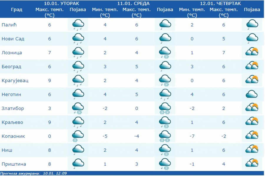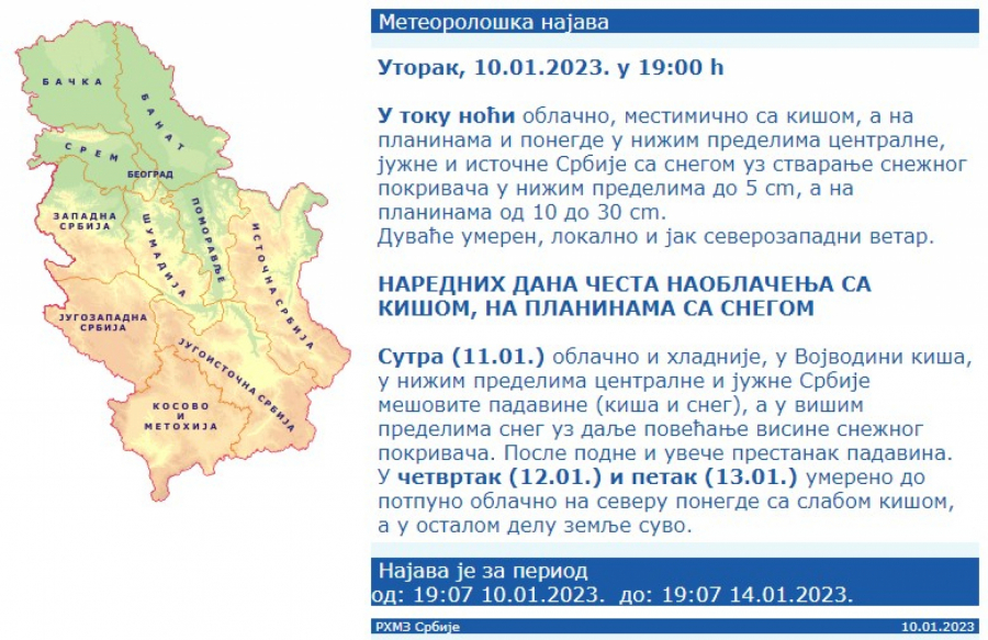 Vreme danas oblačno i hladnije, u Vojvodini kiša, u nižim predelima centralne i južne Srbije mešovite padavine (kiša i sneg), a u višim predelima sneg uz povećanje visine snežnog pokrivača za 5 do 10 cm, lokalno i za 15 cm.