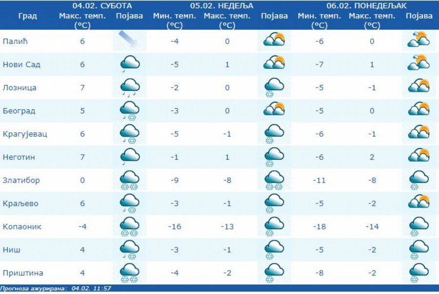 Zbog oluje i vremenskih neprilika otkazano je više vozova između Beograda i Novog Sada. Kako javlja Glas zapadne Srbije, sneg od sinoć pada u višim predelima zapadne Srbije, pre svega u Zlatiborskom kraju, ali i na teritoriji opštine Ivanjica. Doneta je zabrana za teretne kamione, preko Debelog brda, koji povezuje Bajinu Baštu i Valjevo.